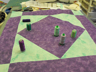 Cutting proved to be extremely painful. I should perhaps have got out my ergonomic cutter but you know what we're like, we just want to get on with it. Things are just taking longer, but they are happening so I'm pleased. I started cutting and stitching yesterday but only got two of the triangles stitched to the centre square. The threads are the possible choices. I shall quilt with the purple on the green and the green thread on the purple.